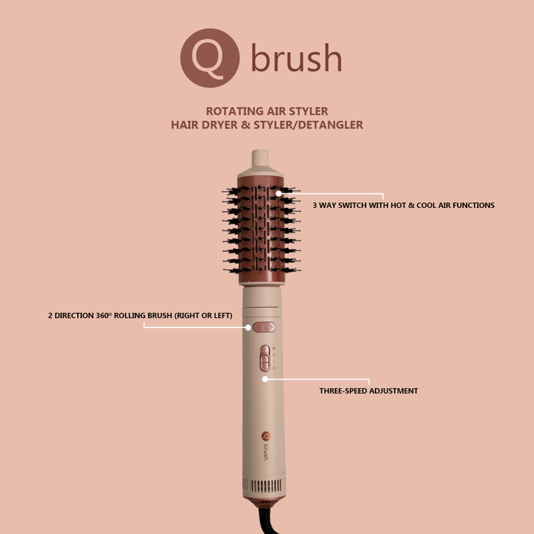 The Q brush Rotating Air Styler is your ultimate multi-tasking companion, engineered to dry, detangle, and style your hair with effortless precision. This versatile tool combines the power of a high-performance dryer with a 360° motorized rotating barrel that mimics a professional blowout, giving you salon-quality results at home.
